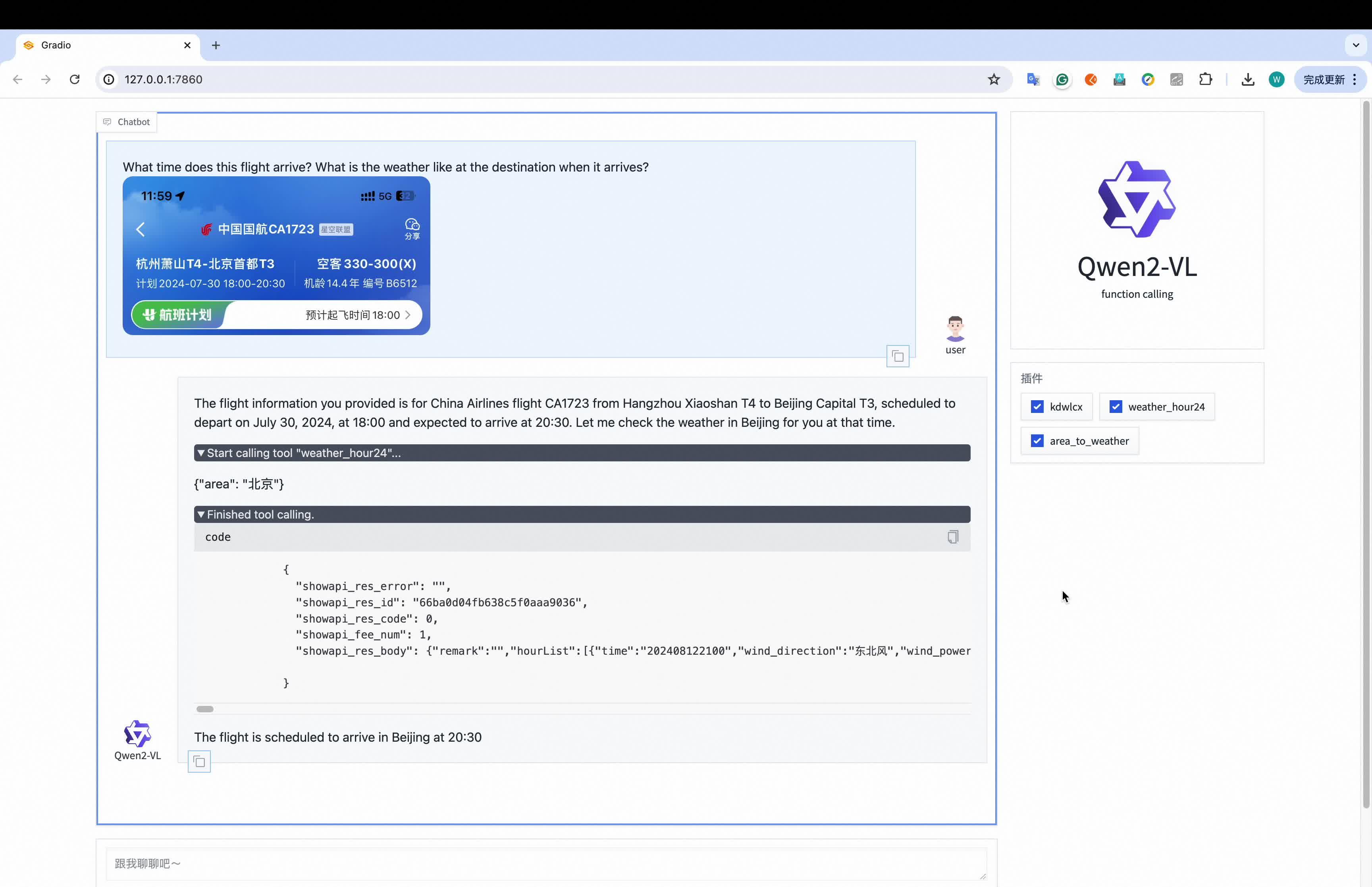 这个挑战主要是测试Qwen2-VL模型对图像中文字的理解能力,在理解之后根据指令查询信息。用户上传了一张航班信息图片,当用户询问到底时间和目的地天气时,就需要大模型去搜索天气信息。从视频上看,Qwen2-VL对于简单的调用工具还是做得不错。