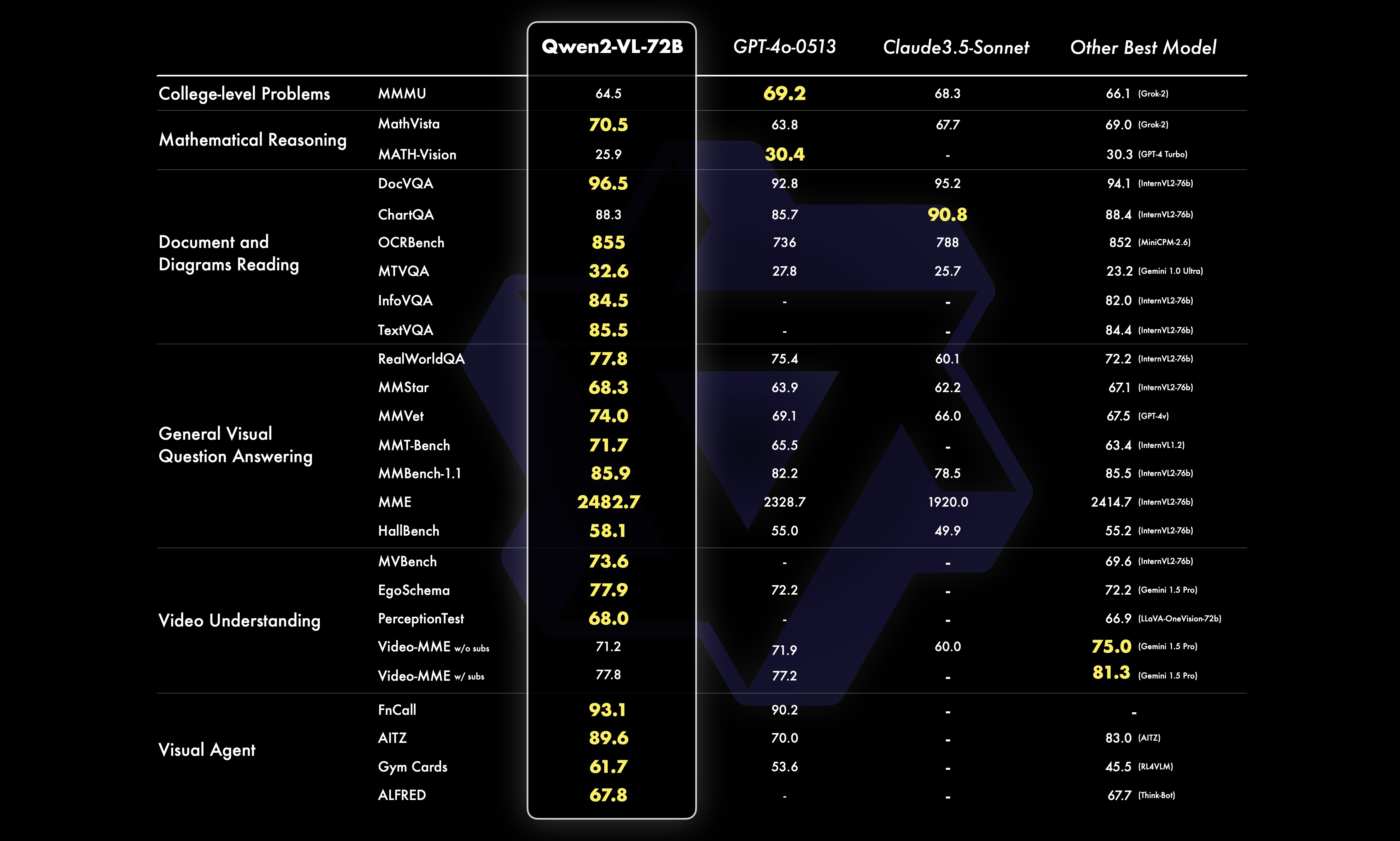 从上面实测图片理解、视频理解和Agent能力,都可以看到Qwen2-VL已经算是一个很强大的多模态大模型。而且从六个方面来评估,包括综合的大学题目、数学能力、文档表格多语言文字图像的理解、通用场景下的问答、视频理解、Agent 能力。Qwen2-VL的大部分能力都已经超越了GPT-4o和Claude3.5-Sonnet。