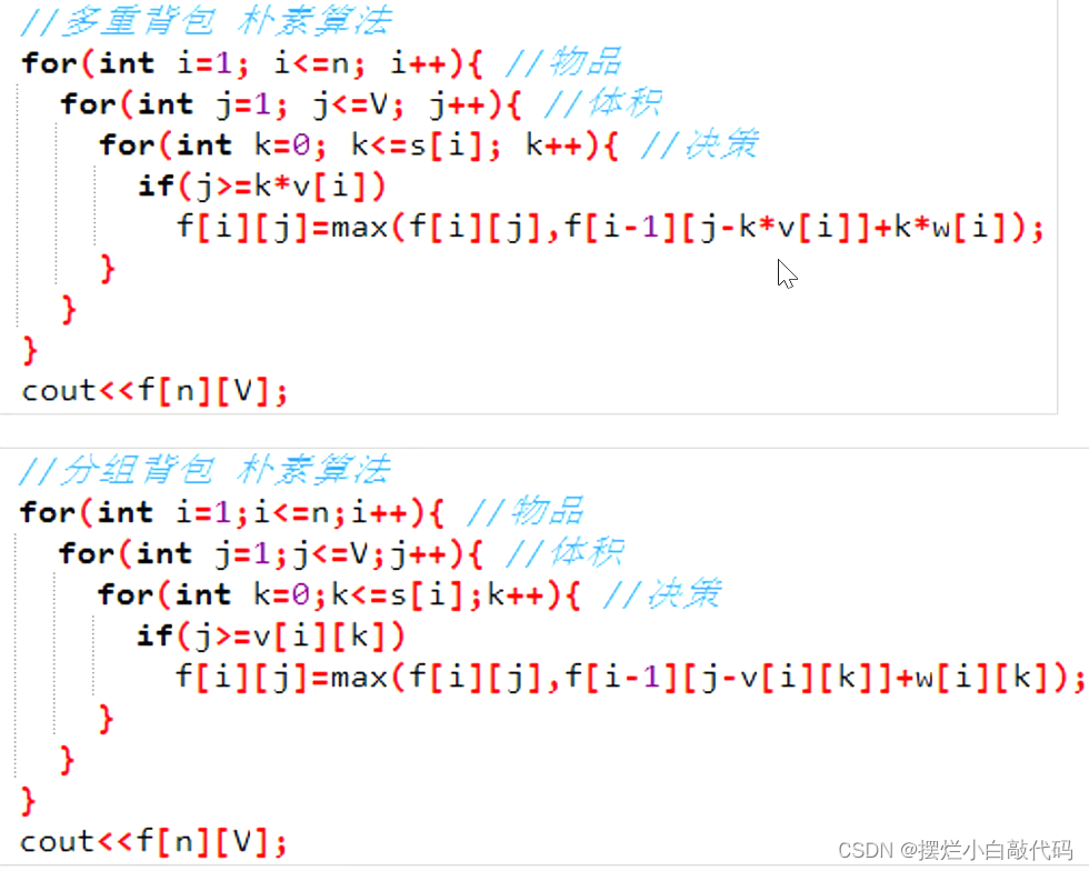 其实看起来跟多重背包的朴素解法差不多,有什么不同的,下面放上了两段代码,比较看一下。不同在了就是在状态转移上了,多重背包呢可以选多个所以用k来控制,分组背包呢,例题中一组背包中最多只允许选一个,就是对于一组背包可以不选可以选一个。每一个物品都是不同的、有个性的,没有完全相同的,第三个for循环就是在枚举每一组具体的物品。