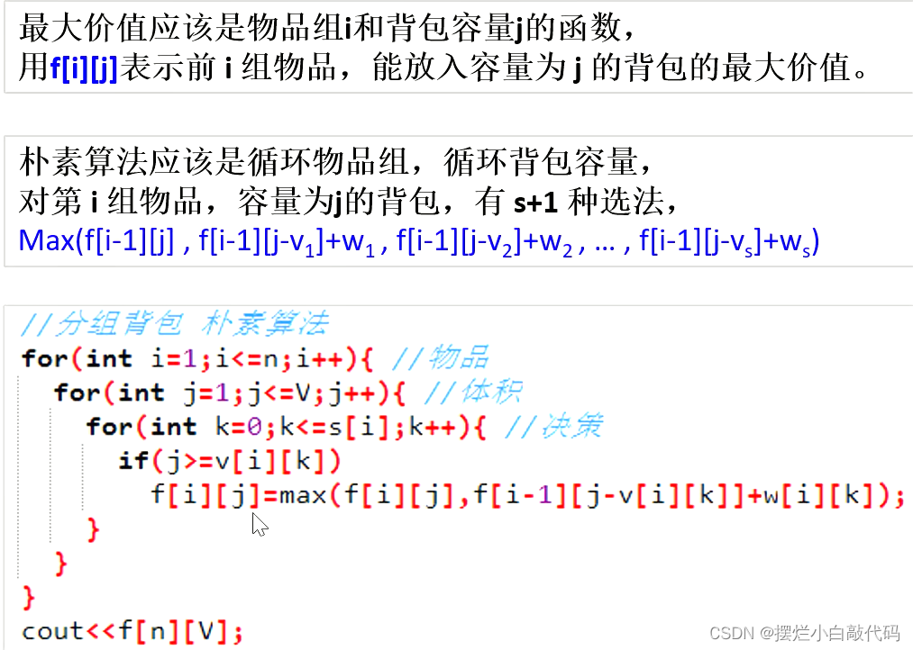 这里朴素解法利用的二维数组f[i][j]来进行状态转移,枚举物品组数,枚举体积,枚举对于每组物品的决策,选还是不选,以得到最优解。这里朴素解法不再详细介绍,只放一个代码段,因为后面还可以优化一下。