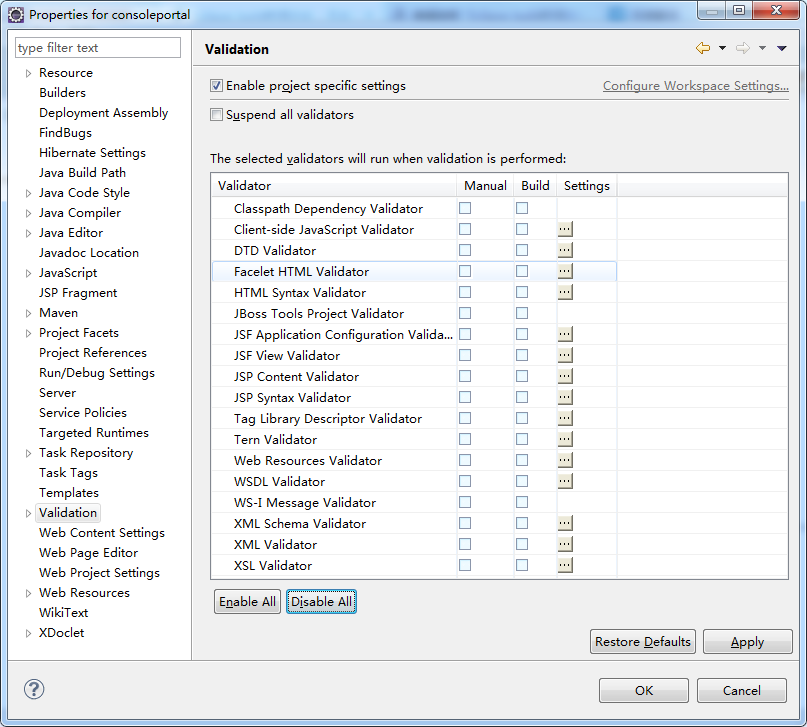 3、右键项目-属性-validation 里面的所有Validator 全部关闭了..