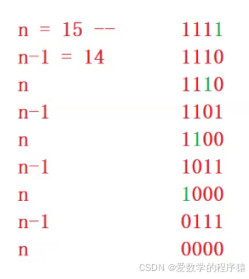 n &= (n - 1);//即n=n&(n-1)进行n&(n-1)运算再把得到的结果赋值给n