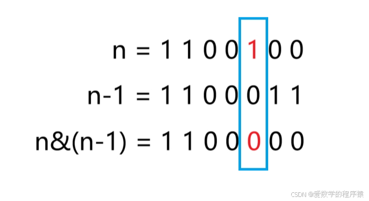 n&(n-1)这个操作的作用是:将整数n的二进制表示中的最低位的1变为0。