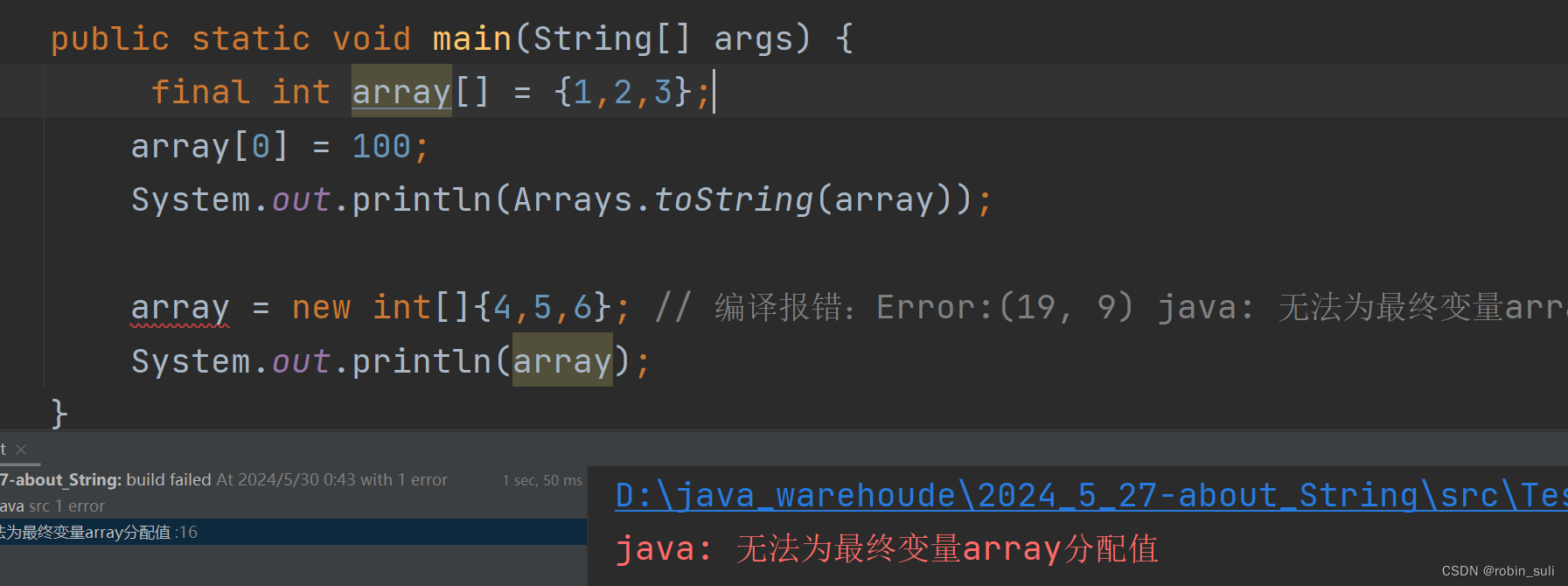 5.但是由于维护数组的value(就是引用,也可以理解为地址),被private修饰:所以,数组的引用不能被修改: