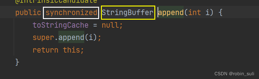 1.StringBuffer 和 StringBuilder append方法源码如下:StringBuffer被synchronized修饰,所以,在多线程情况下,可以保证线程安全(相当于他有一个锁,在做事时候不会被别人打扰),StringBuilder 则在单线程情况下,可以保证线程安全