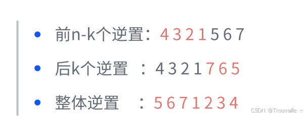 我们可以先将所有元素翻转,这样尾部的 kmodn 个元素就被移至数组头部,然后我们再翻转 [0,kmodn−1] 区间的元素和 [kmodn,n−1] 区间的元素即能得到最后的答案