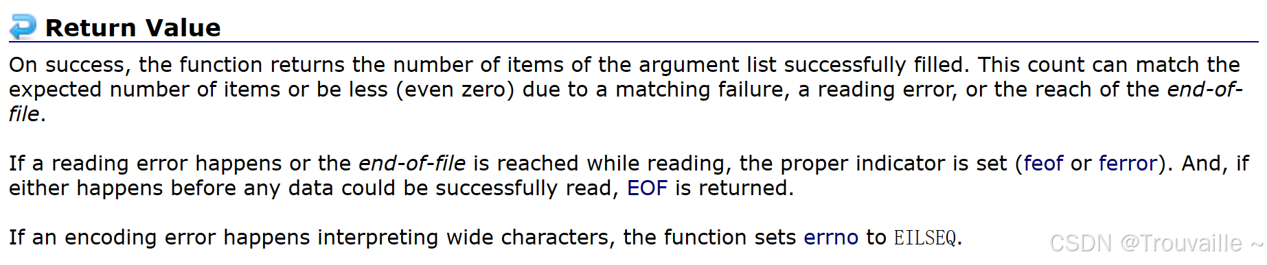 如果在成功读取任何数据之前,发⽣了读取错误或者遇到读取到⽂件结尾,则返回常量EOF(-1)。