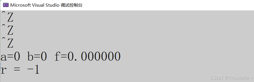 在VS环境中按3次 ctrl+z ,才结束了输⼊,我们可以看到r是2,表⽰正确读取了2个数值。 如果⼀个数字都不输⼊,直接按3次 ctrl+z ,输出的r是-1,也就是EOF