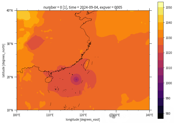 slp = slp.rename({'valid_time':'time'}).isel(time=slice(0, 10))print(slp)<xarray.DataArray 'msl' (time: 10, latitude: 721, longitude: 1440)> Size: 42MB