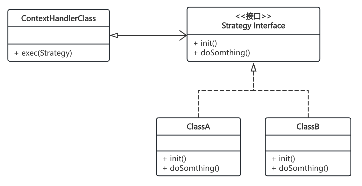 策略模式,主要包含环境类(Context)、策略接口(Strategy)和具体策略实现类(ConcreteStrategy)。