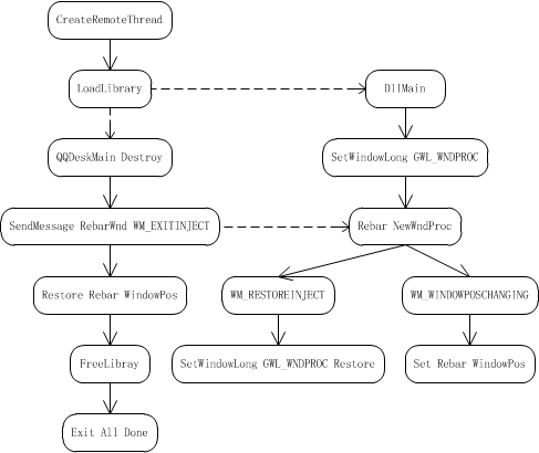 原理一样,CreateRemoteThread->LoadLiibray->DllMain,SetWindowLong GWL_WNDPROC->WM_WINDOWPOSCHANGING.