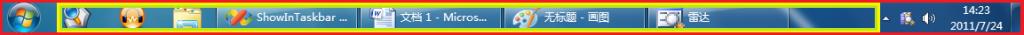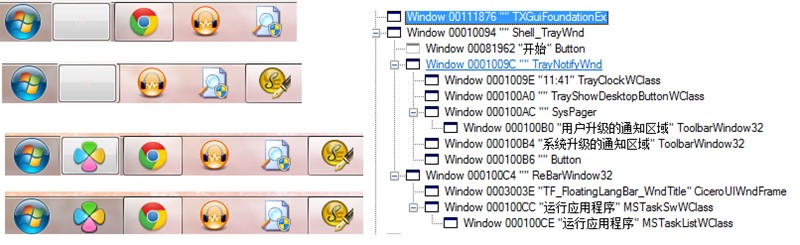 Win7: 红色区域:类名是Shell_TrayWnd的容器 黄色区域:类名是ReBarWindow32的二级容器 绿色区域:类名是MSTaskSwWClass的窗口 WinXP: 红色区域:红色区域——类名是Shell_TrayWnd的容器 黄色区域:类名是ReBarWindow32的二级容器 绿色区域:快速启动区域 紫色窗口:类名是MSTaskSwWClass的窗口 |