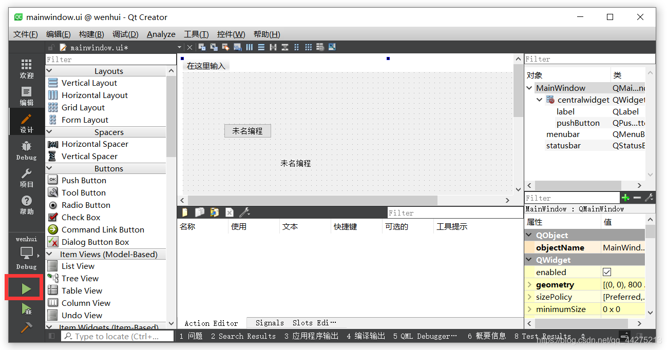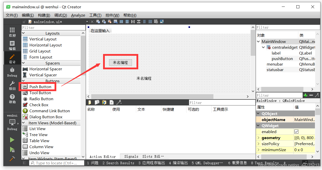 将左边对应的模块拖到右边,然后输入文字即可。这里拖入了一个按钮和一个标签。