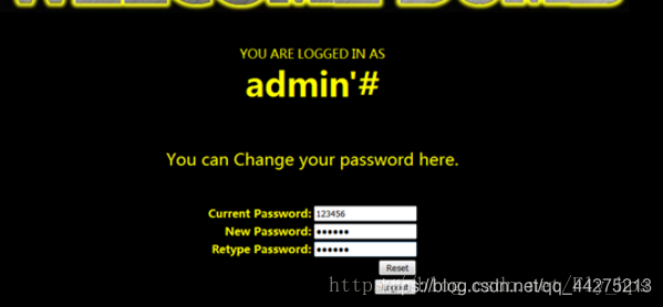 此例子中我们的步骤是注册一个admin’#的账号,接下来登录该帐号后进行修改密码。此时修改的就是admin的密码。