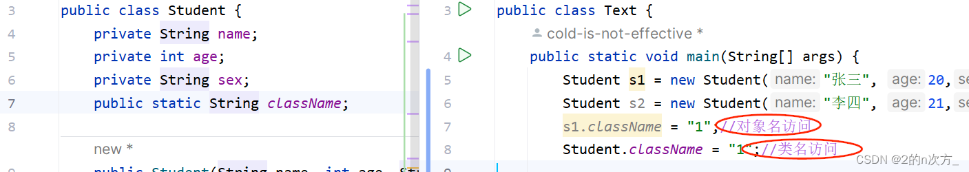 仍然可以通过对象名访问,但是并不推荐这种写法,因为static修饰的成员变量已经和对象没有关系了,推荐使用类名进行访问 通过static就可以把对象的公共属性设置成静态变量,通过类名访问。