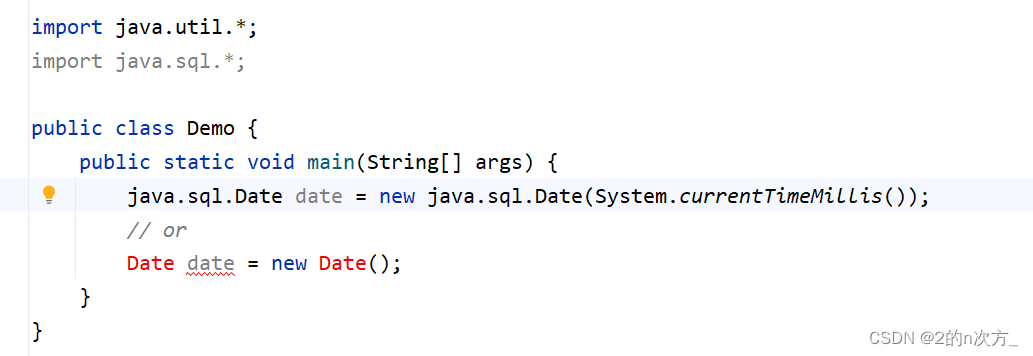 例如上面的例子,util 和 sql 包底下都有Date类,这样就不知道写的是哪个包中的Date,所以编译器直接报错了,还是推荐导包的时候要导全
