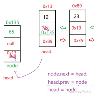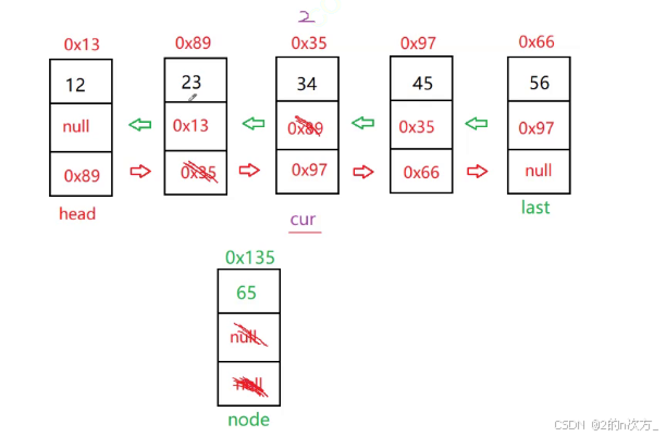 }需要修改四个位置,把要插入的节点node的next 指向cur,再把cur.pre的next指向node,此时节点的next都有了指向,接着node的pre指向cur.pre节点,cur的pre再指向node,此时就完成了插入