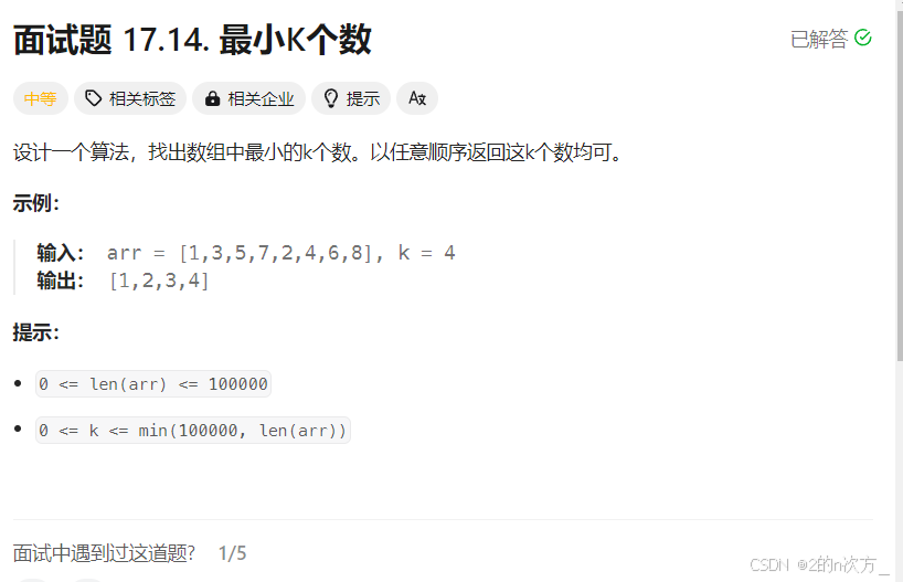 1.整体进行排序,取出前k个元素 2.创建小根堆,拿出k个堆顶元素 3.把前k个元素创建为大根堆,遍历剩下的N-k个元素,和堆顶元素比较,如果比堆顶元素小,就删除堆顶元素,当前元素入堆,遍历完成后小根堆中的k个元素即为所求