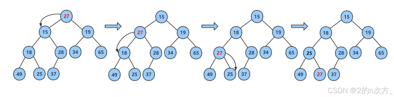 }将一组数据从小到大进行排序,使用到的是大根堆,大根堆的根节点肯定是最大的,然后把根节点和末尾元素交换,接着进行向下调整,然后新的根节点再和倒数第二个元素交换,以此类推,最终就可以实现从小到大排序的效果