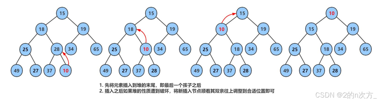 插入的思路就是先把元素放在最后,接着调用向上调整,依次把要插入的元素调整到适合的位置