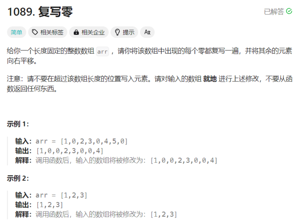 思路:先找到最后一个复写的数,然后从后往前判断复写边界问题,如果最后一个复写的数为0,意味着 dest需要往后移动两位,此时就会造成越界修改,此时就需要进行判断,但不能通过 arr[cur]来判断,需要根据dest的位置来判读,因为arr[cur]为0时也存在两种情况:dest往后移动两位刚好等于数组长度或超出一个数组长度