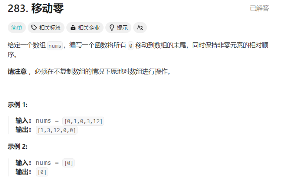 维护三个区间 0~dest为非0元素 , dest + 1 ~ cur -1 都为0 ,cur ~ n-1为待处理元素