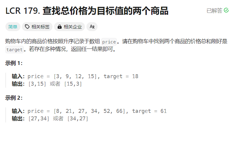也就是两数之和的问题,由于已经是排好顺序的数组,并且返回任意结果都行,通过使用双指针,如果left + right小于目标值,就把left左移,反之,把right右移
