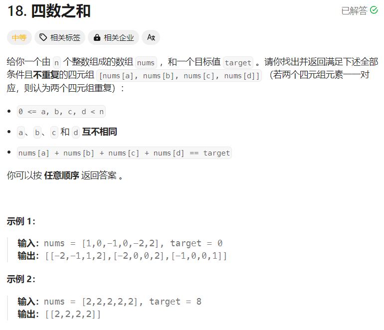 四数之和也就是在三数之和的基础上再确定一个数,需要注意的是,此时需要去重的点有:第一个确定的数和第二个确定的数,进行双指针算法时的left和right