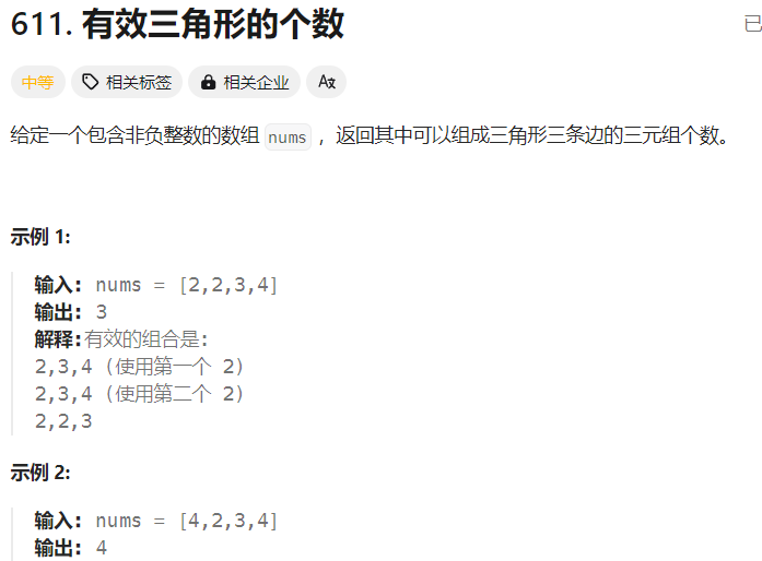 思路: 这里进行一个优化:先把数组排序,已经排好序的三个数中,较小的两个数之和大于最长的那条边,就可以判断为三角形还是通过双指针,从后往前,先确定一个最长的边,然后从剩下的区间中开始判断,由于已经排好序了,所以如果最小的那个数加起来就已经大于第三边,那么剩下的所有就都符合,同理,此时再把右指针左移,确定下一个区间