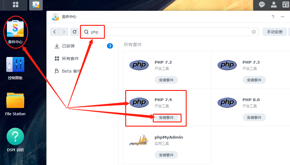 打开群晖系统的套件中心,在搜索框中输入php,从中找到php7.4,点击图标下方的“安装套件”进行安装。