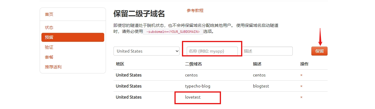 进入cpolar官网并登录个人账号后,我们点击页面左侧的“预留”项,找到“保留二级子域名”栏位。在这个栏位中,我们需要对三项信息进行定义。首先是“地区”,该栏与cpolar客户端一样,选择实际使用地区即可(这里我们填入China VIP);接着是“名称”栏位,这个栏位填入的信息最终会显示在公网地址中,因此可以选择清晰明了的内容(我们填入网页内容lovetest,在这里如果您点击保留时提示此域名已被其他用户注册,您可以根据个人需要进行更改,如LoveTest等等);最后是这条数据隧道的描述,也可以看做注释,方便我们区分不同数据隧道所指向的内容。