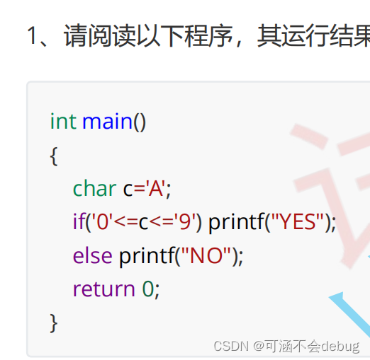 0'<=c<='9' 并非判断 x 大于等于字符 0, 小于等于字符 9 ,而是 先执行'0'<=c ,使用这个表达式的结果再和 '9' 比较, '0' 的 ASCII 码值是48 , 'A' 的 ASCII 码值是 '65' ,故 '0'<c 是真值 1 , 1 无疑是小于字符 '9' 的,最终是真