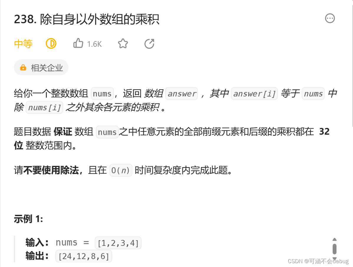 题目中要求使用O(N)的算法进行计算,我的第一想法是将所有数据相乘,遍历一遍数组元素,然后分别相除,但题目中有要求不能使用除法,但是除法与乘法互相转换的。