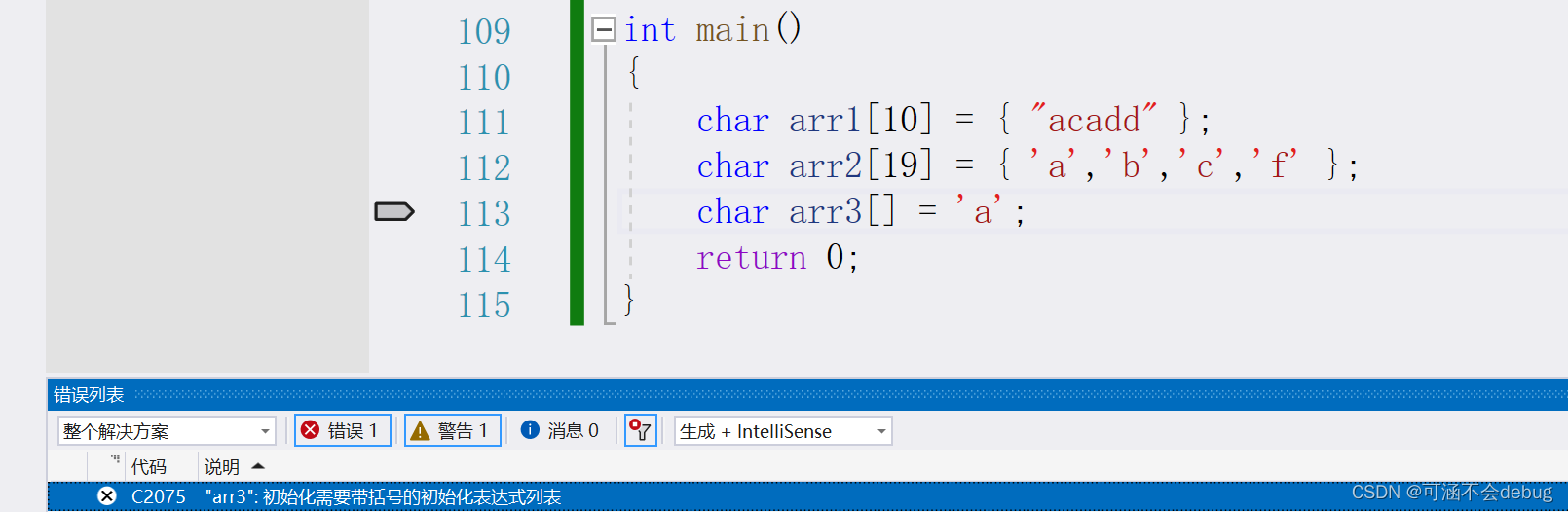 arr1和arr2都是合法的,arr3报错是字符数组初始化需要带括号的初始化表达式。