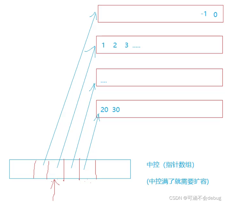 首先deque多了一个叫做中控数组的东西,本质上是存储一段一段空间的指针数组。
