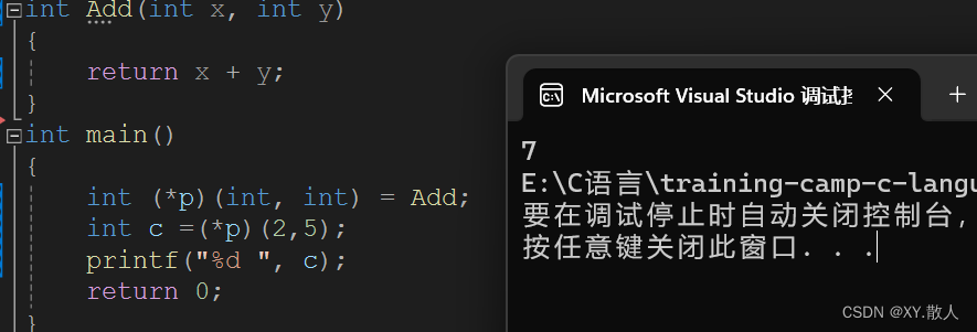 看吧,函数Add的参数是两个int类型,所以那个括号括的就是函数参数的类型,有一个值得注意的点就是函数指针的参数可以只写类型,不写具体的变量。但是定义函数的时候是不能这样操作的,系统会报错。函数的参数有多少,不管是什么类型,创建函数指针变量的时候都要一起写进去,即便是结构体类型也要写,虽然很少见。