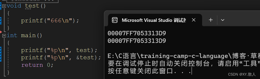 地址看到了吧?结果是一样的吧?那么你也猜到我要说什么了,在上一篇提及到,函数名和数组名一样特殊,数组名是首元素地址,函数名是函数的地址,所以打印的时候我有没有&符号都是一样的。