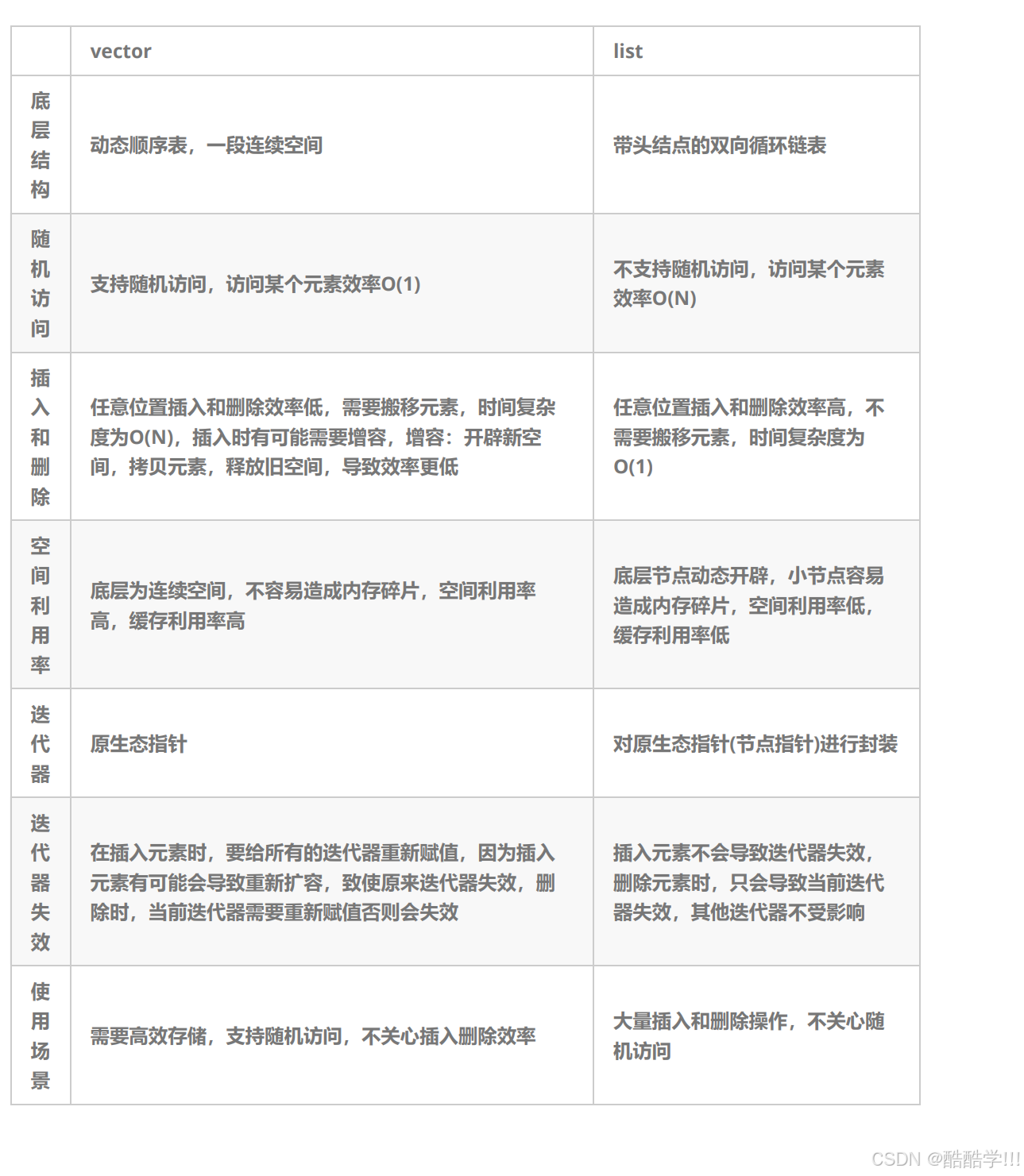 }vector与list都是STL中非常重要的序列式容器, 由于两个容器的底层结构不同, 导致其特性以及应用场景不同, 其主要不同如下: