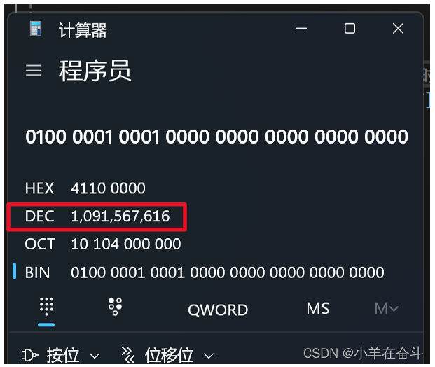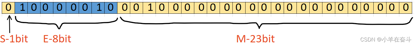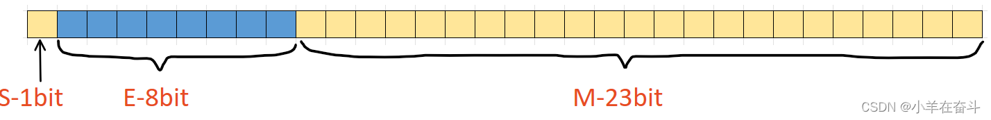 对于32位的浮点数(float),最高的1位存储符号位S,接着的8位存储指数E,剩下的23位存储有效数字M。