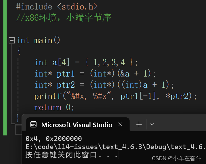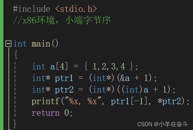 数组名a表示数组首元素的地址,强转为int类型的整数再+1,再强转为int *类型的指针,最终的结果就是数组首元素的地址+1(整数+1),注意ptr2是一个整型类型的指针,所以它访问的是4个字节的地址。