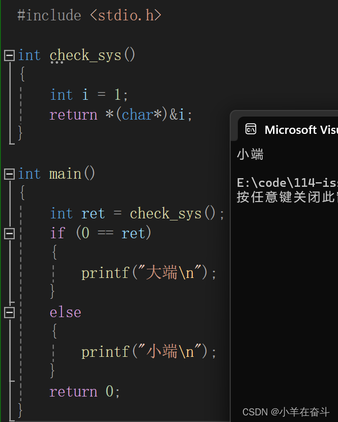 如果我们想知道当前的机器使用的是哪种存储方式,可以写一个简单的判断小程序来实现。当我们在一个整型变量中存一个整数1时,如果当前机器是大端字节序存储,那么它存的就是 00 00 00 01,如果当前机器是小端字节序存储,那么它存的就是 01 00 00 00。既然如此,我们只需要将这个整型变量最小字节中的数据拿出来,看这个最小字节单元中存的数是0还是1,如果是0就是大端字节序存储,反之则为小端字节序存储。