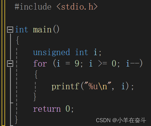 上面这个代码也是如此,当i为0时,0-1就变成了2^32-1,因为在unsigned int的世界里没有负数,所以程序陷入了死循环。