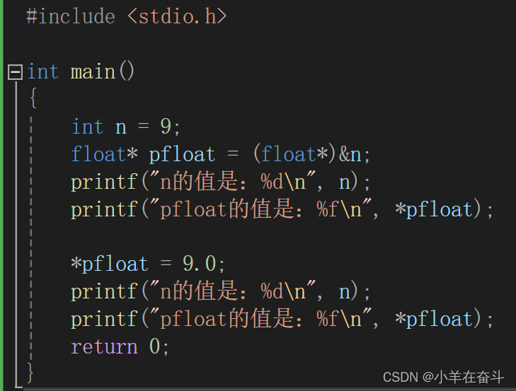 创建一个整型变量n赋值为9,用%d打印时就按常规打印出整数9。我们再取出n的地址将其强转为float *类型的指针再赋给pfloat,再解引用pfloat用%f打印,9在内存中的补码是: