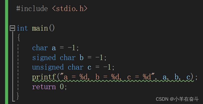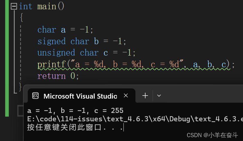 我们想将整数-1存入一个字符型变量a中,整型和字符型不兼容,通过C语言(操作符)2的学习我们知道要发生截断,所以只将-1的补码的后8位存到a中,我们又用%d(打印有符号整型)打印字符型变量a,那%d就认为它打印的数是整型,a不是整型所以要发生整型提升,a是char(signed char)类型,整型提升高位补符号位,补完后还是32个1,取反加一得原码又变为了-1,最终结果就打印出了-1,因为在VS中char和signed char是一样的,所以打印b也就同样的道理。