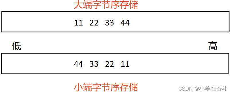 也就是说,大端字节序存储是地址由低到高依次存高位,小端字节序存储是地址由低到高依次存低位。