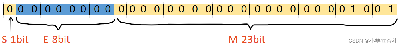 而将9.0存到float *类型的地址中时,9.0用二进制表示为:1001.0,根据 IEEE 754 规定,S=0,M=1.001,E=3,那在内存中的存储就应该是下面这个样子的: