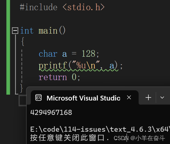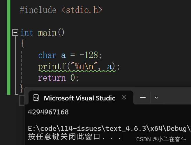 将整数-128(补码:11111111111111111111111110000000)存入(signed)char类型a中,截断后a中存的是10000000,用%u(打印无符号整数)打印需要整型提升,a为signed char所以高位补符号位,补完就是11111111111111111111111110000000,目前还是补码,但是在%u眼中无符号整形原反补相同,所以%u再以原码打印出来就是4294967168。