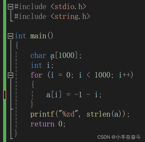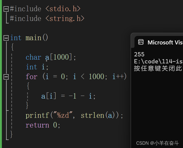 创建一个字符数组大小1000,向数组中存入-1、-2、-3..,然后strlen求字符数组a的长度。我们知道strlen是求字符串的长度,统计的是\0之前的字符个数,那看来意思就是让我们找字符‘\0’了又因为a是字符数组所以-1、-2、..、-127、-128、127、126、...、2、1、0,0在字符眼中就是\0,所以求的是-1~0的长度,是255。
