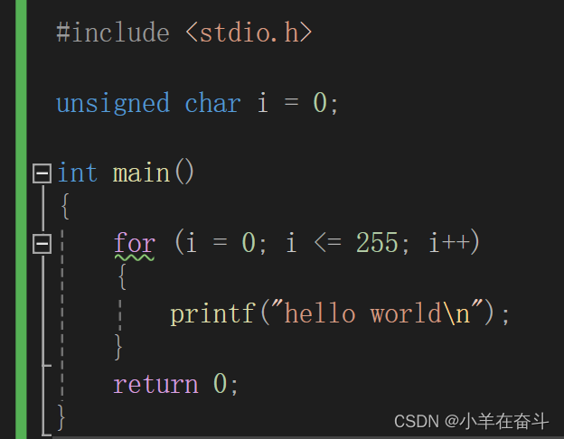 unsigned char的范围是0~255,所以上面的代码给我们的感觉就是打印255个hello world,但事实真是如此吗?当我们运行起来就会发现程序陷入了死循环。这是因为当i加到256时虽然此时不满足循环了,但是这时候的256只是数学上的256,而在unsigned char眼中255+1就变成了0,所以循环继续。