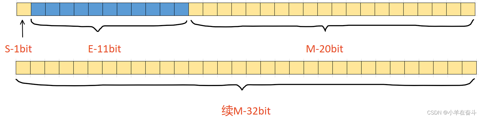 对于64位的浮点数(double),最高的1位存储符号位S,接着的11位存储指数E,剩下的52位存储有效数字M。
